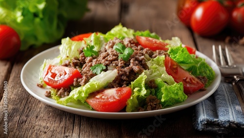 salad, ground beef, lettuce, tomatoes, plate, food, healthy, lunch, dinner, fresh, vegetable, protein, cookery, dish, meal, dietary, eatery, simple, easy, quick, brown, red, green, wooden, rustic, table, fork, knife, spoon, ingredient, appetising, alimentary, balanced, natural, delicious, freshness, savoury, homemade, seasoned, flavorful