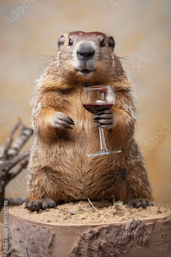 Groundhog Day Cheers: A Celebratory Toast with Red Wine by a Whimsical Groundhog. Illustration Of A Cheerful Groundhog Wine Testing.