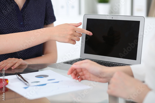 Group of business people at meeting discussing financial results. Women pointing into laptop computer monitor