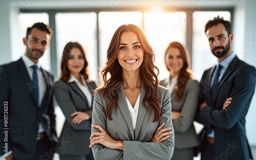 Group of business professionals standing confidently in office with blurred motion effect and sunlight through large windows. High quality