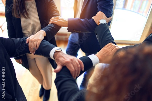Group of business workers standing on a circle doing symbol with hands and arms together at the office.