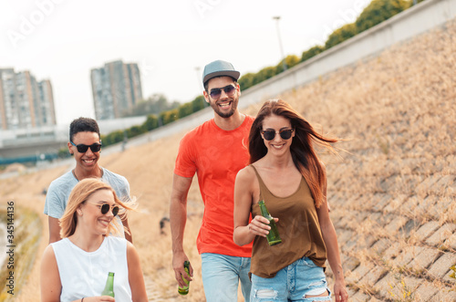 Group of cheerful friends walking through the city by the river talking and having fun.