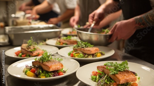 Group of chefs assembling colorful plates with greens, tomatoes, herbs, and salmon fillets