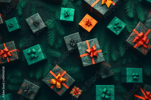 Group of Christmas gifts on a dark green background.