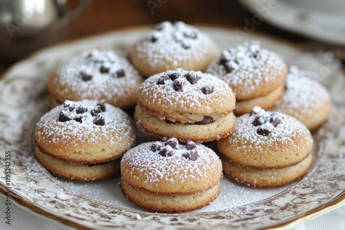 biscuit, cookie, chocolate, chips, sugar, powdered, icing, plate, vintage, food, dessert, sweet, pastry, bakery, homemade, brown, white, round, stacked, group, delicious, tasty, snack, treat, closeup, background, nobody, indoor, eating, cooking, preparation