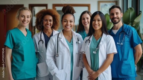 Group of doctors of different nationalities and genders looks at camera and smiles