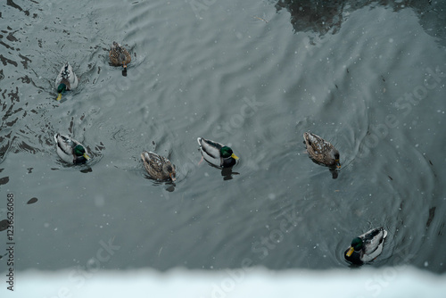 group of ducks are swimming on the river during winter season in Otaru Hokkaido. Top view angle photograph. Travel or animal background