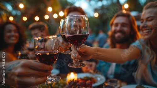 Group of friends toasting with red wine, celebrating together at an evening outdoor party with lights