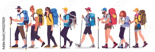 hiking, travel, adventure, backpack, nature, outdoors, group, people, team, trekking, expedition, mountain, trail, forest, landscape, journey, exploration, excursion, walking, stick, pole, sport, fitness, active, healthy, lifestyle, tour tourism, holiday, vacation, summer, fun, joy, serenity, freedom, discovery, destination, man, woman, young, adult, illustration, cartoon, graphic, design, vector, flat, style