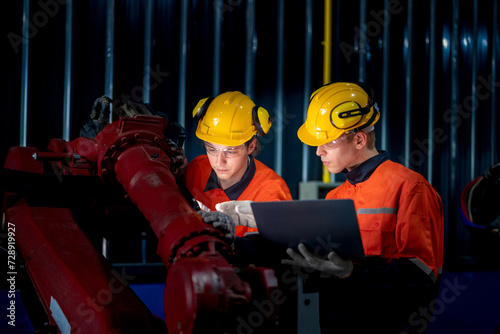 group of male engineer workers maintenance automatic robotic arm machine in a dark room factory. worker checking and repairing automatic robot hand machine. Worker wearing safety glasses and helmet.