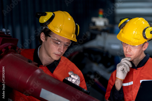 group of male engineer workers maintenance automatic robotic arm machine in a dark room factory. worker checking and repairing automatic robot hand machine. Worker wearing safety glasses and helmet.