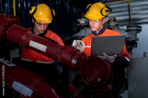 group of male engineer workers maintenance automatic robotic arm machine in a dark room factory. worker checking and repairing automatic robot hand machine. Worker wearing safety glasses and helmet.