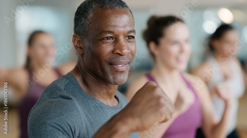 group, people, dance, class, foreground, man, grey, smiling, flexing, fist, middle, arm, stretched, woman, pose, wearing, physical exercise, clothes, room, large, mirror, wall, background, blurred, motion, mood, energetic, teamwork, diversity, collaboration, lifestyle
