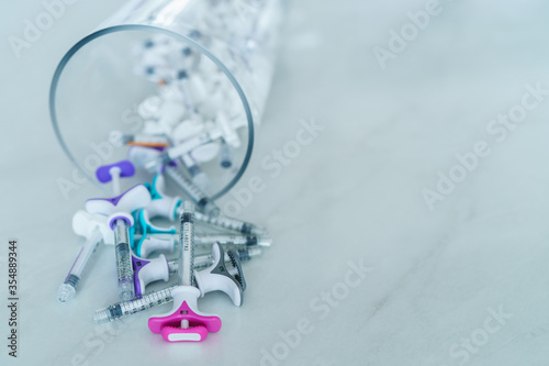 Group of plastic syringe for filler injection on white background. filler needle