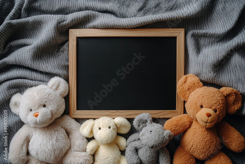 Group of plush teddy bears and a blank chalkboard or letter board on a cozy grey blanket with copy space
