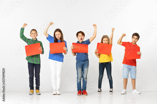 Group of screaming serious children with red empty banners isolated on white studio background. Education and advertising concept. Protest and children's rights concepts.