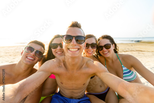group of smiling friends making selfie on beach