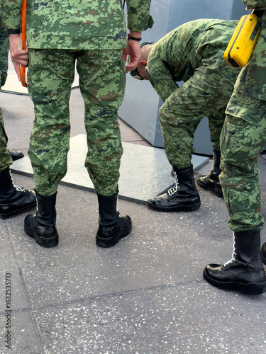 Group of soldiers in green camouflage uniforms and polished black boots on city pavement, ideal for illustrating security forces, defense, and military operations.