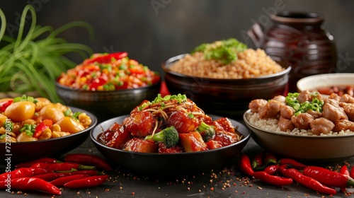 group of tasty Chinese dishes, beautifully arranged on a colorful background
