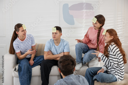 Group of teenage friends with sticky notes on their foreheads playing guess who game at home