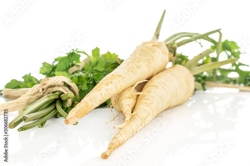 Group of three whole hamburg white parsley root with tied leaves with straw rope isolated on white background