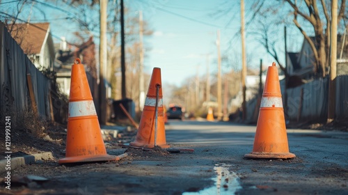 traffic, cone, utility, pole, repair, road, construction, urban, environment, safety, orange, barrier, work, infrastructure, maintenance, city, equipment, signage, prevention, roadside, obstacle, project, area, team, location, precaution, visibility, warning, management, asphalt, blockage, tool, neighbourhood, surrounding, men at work, site, signal, disruption, task, service