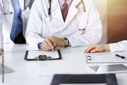 Group of unknown doctors are sitting at the desk and discussing problems or disease treatment in sunny hospital office. Covid 2019