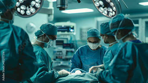 group of veterinarian surgery in operation room take with art lighting and blue filter