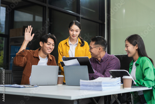 Group of Young Asian business team creative businesspeople coworker in office Happy to be successful partnership teamwork success concept.