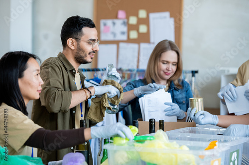 volunteer, people, person, woman, man, young, adult, occupation, work, job, indoor, group, team, teamwork, help, support, caucasian, asian, intercultural, multiracial, ethnicity, office, container, sorting, eco, lifestyle, natural, ecological, environment, environmentally friendly, care, waste, trash, reusing, recyclable, plastic, paper, bin, material, reuse, garbage, gloved, bottle, can, tin