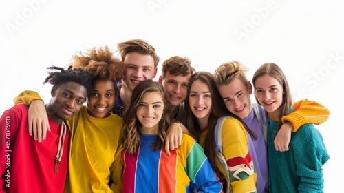 Group of young people in colorful clothes with hands on shoulder standing on white background