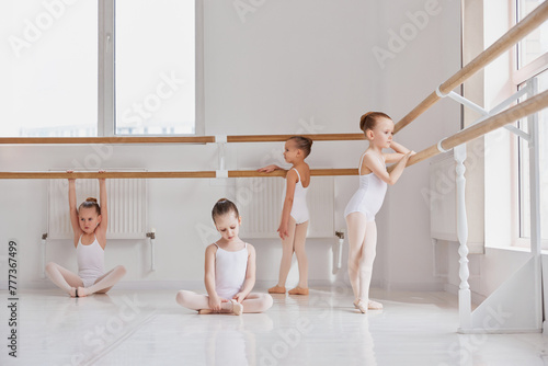 Group portrait of little girls in leotards ballet students stretching at barre in sunlit dance studio. Classical ballet school. Concept of art, sport, education, hobby, active lifestyle, leisure time.