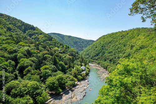 mountain, river, mountain, japan, kyoto, park, vale, forest, flux, mount, nature, green, countryside, panorama, heaven, recreation, travel, summer, outlook