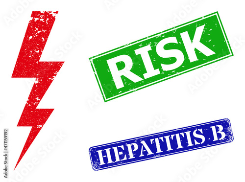Grunge electrical energy icon and rectangular rubber Risk seal. Vector green Risk and blue Hepatitis B seals with unclean rubber texture, designed for electrical energy illustration.