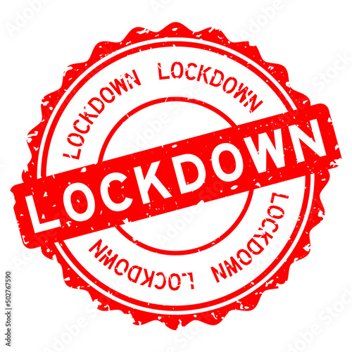 Grunge red lockdown word round rubber seal stamp on white background