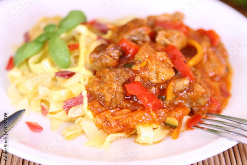 goulash, pork, noodle, basil, green, cooking, vegetable, italian, tomatoes, fork, knife, plate, white, salad, ham, noodle, meat, paprika, red, food, food, kitchen