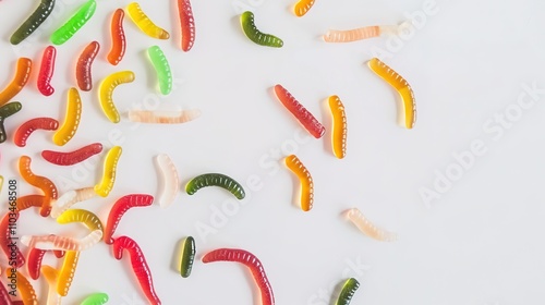 Gummy Worms and Candy on White Background - A Sweet and Colorful Confectionery Display. The Delightful Gummy Worms and Assorted Candies on the Plain White Background, with Their Bright Colors and Temp