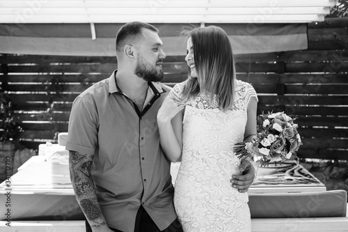 guy and girl look at each other, portrait of a romantic couple,man and woman kissing in a dramatic light, girl holding flowers in hands, young beautiful bride in white dress holding wedding bouquet