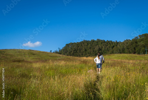 Guy and girl walking through field