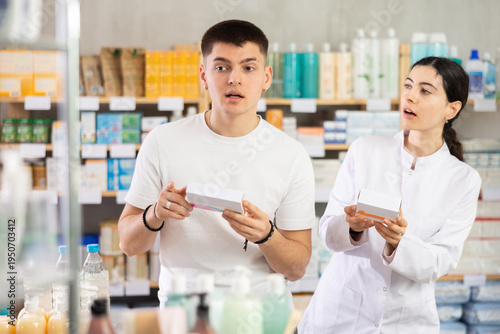 Guy chooses pills in modern pharmacy. Female pharmacist helps with choosing a medicine