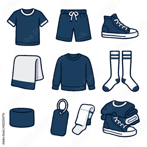 vector, icon, wrist, pile, gear, tee, sneaker, gym, shirt, basic, perspiring, short, sock, towel, tags, sport, locker, drawstring, set, backpack, learning, education, student, supply, school, collection