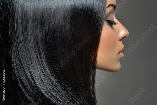 hair, woman, beauty, long, fashion, model, face, profile, coiffure, straight, care, glamour, black, brunette, brown, style, skin, person, head, closeup, make-up, 1, studio, people, salon