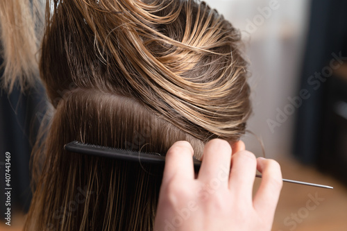 Hairdresser checking blonde womens regrown roots. Preparing for hair coloring and hair cutting at home or at salon.
