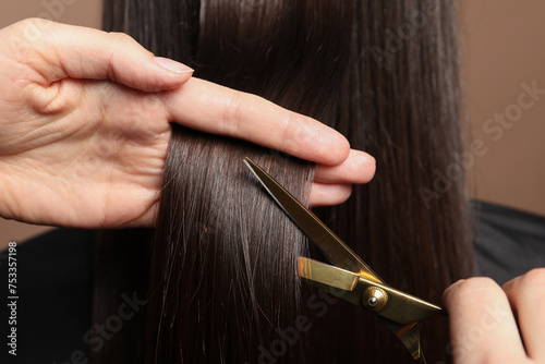 Hairdresser cutting client's hair with scissors on light brown background, closeup