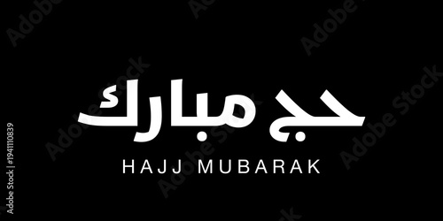Hajj Mubarak written in Arabic calligraphy with English transliteration. The phrase means “Blessed Hajj,” a greeting used to congratulate Muslims completing the pilgrimage.