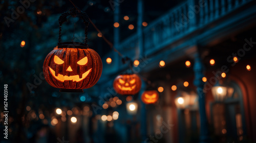 Halloween lanterns with carved faces glowing in dark street, halloween, lanterns, jack-o-lantern, glowing, street, night, spooky, eerie, festive, october, autumn, seasonal