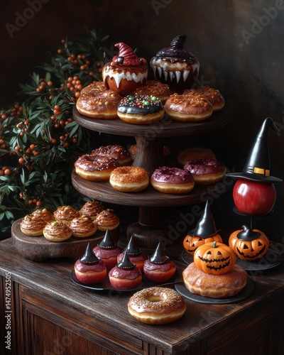 donut, halloween, dessert, pastry, treat, skittish, sweet, delicious, food, baked goods, cake, icing, decoration, sorcerer, pumpkin, apple, party, celebration, fall, autumn, display, wooden, racked, tiered, epicure, colourful, festive, creative, unique, holiday, bakery, homemade, baked, sugar, frosting, cranberry, blueberry, chocolate, sprinkle, whipped cream, glazed, iced, seasonal