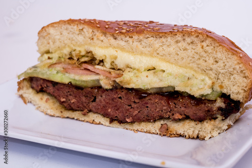 halved cheeseburger on white background