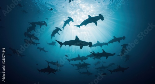 shark, swimming, hammerhead, underwater, ocean, marin, sea, animal, wildlife, diving, fish, deep, aquatic, silhouette, sunlight, water, school, group, nature, travel, adventure, tropical, exotic, predator, cartilaginous, oceanic, conservation, environment, marine life, ocean life, undersea, tropical water, marine animal