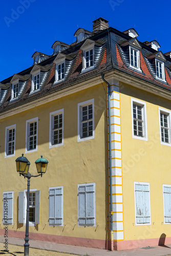 memorial, german, hesse, tourist attraction, arcade, bow, culture, diet, recreation, travel, summer, park, garden, idylli, ease, theatre, baroque, cloud, william, architect, historic, architecture, veneer, in plaster, yellow, lamp, panorama, scenic